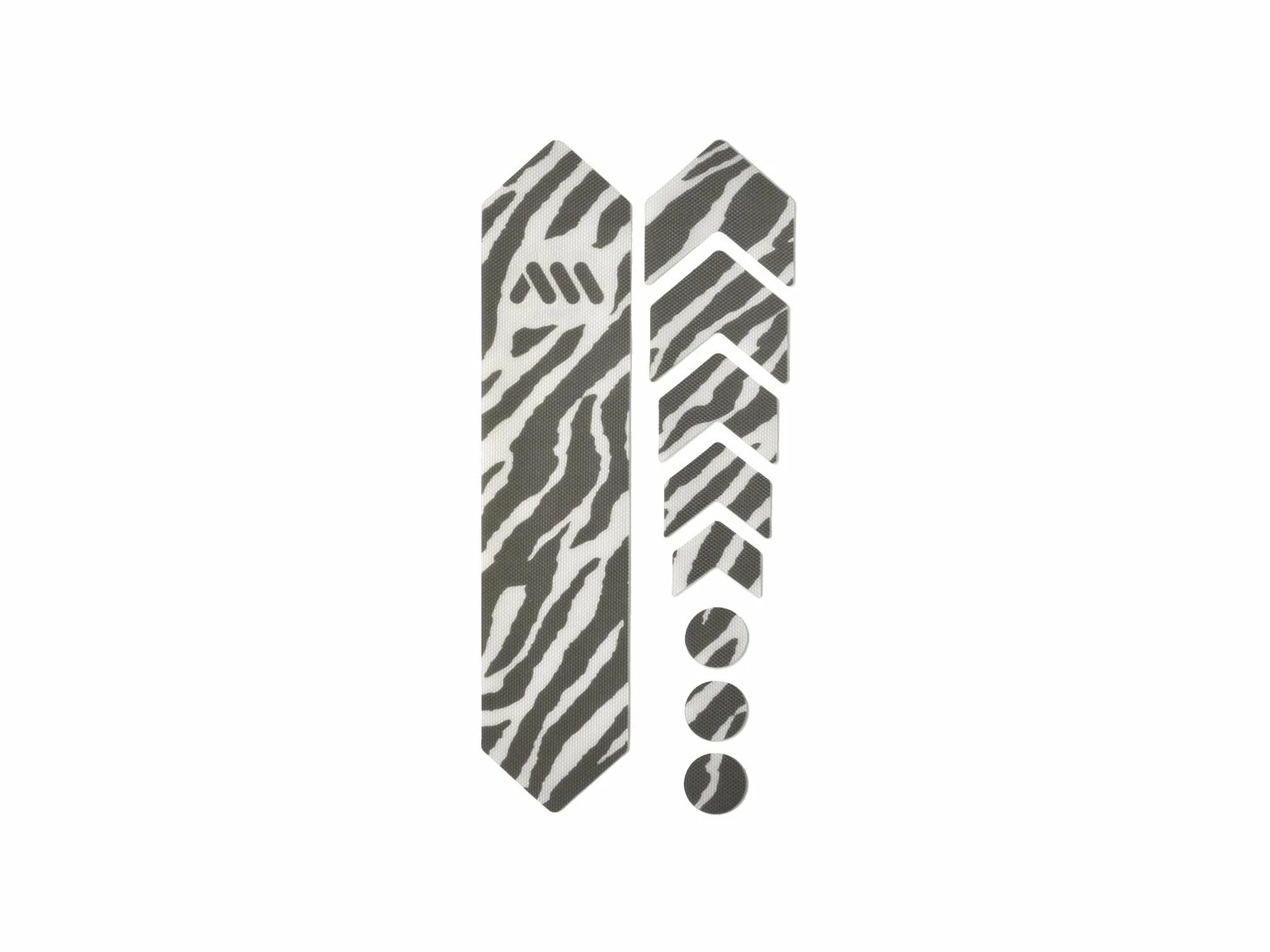- 9 parts for a universal protection system: 1 big part for the down tube; 5 arrow parts for extending the down tube protection or for the chainstay or for top tube; 3 circles for cable wear protection.